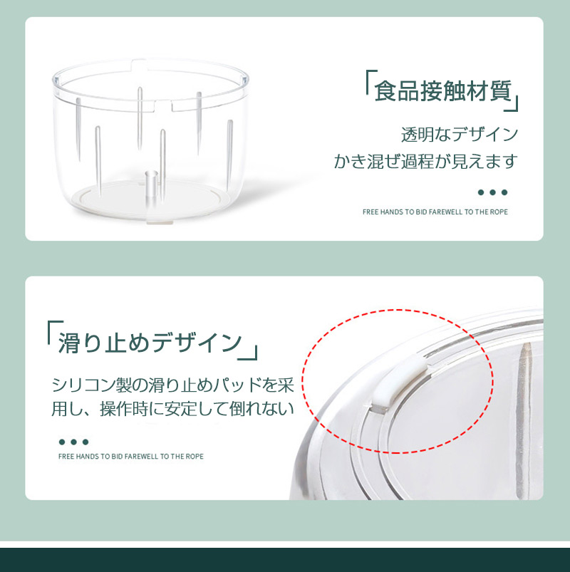 マシンの上を手のひらで押すだけでみじん切りができるプッシュタイプです。紐引きタイプやハンドルタイプのように手動で引っ張ったり回したりする必要がなく、女性でも気楽に効率よく使用できます。防水設計のためお手入れも簡単にできます。