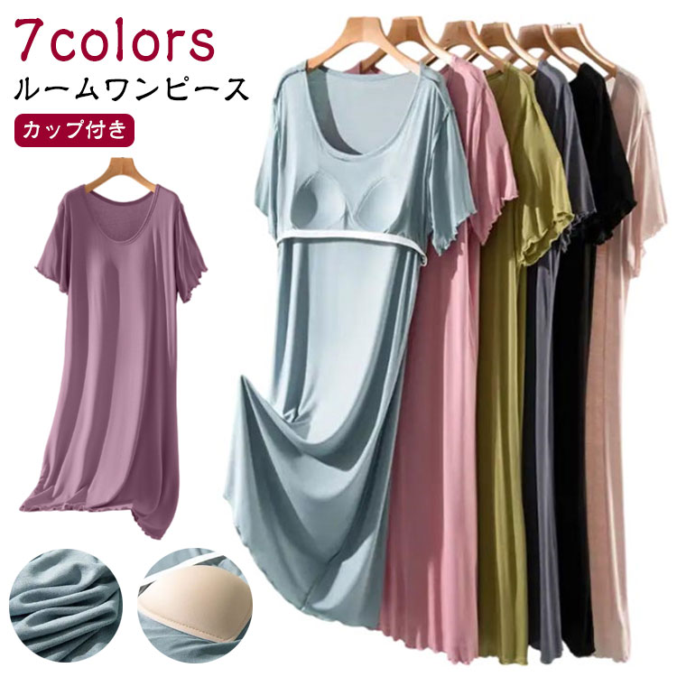 カップ付き パジャマ 半袖 ナイトウエ ブラック グレー ブルー ピンク ベージュ グリーン パープル M L