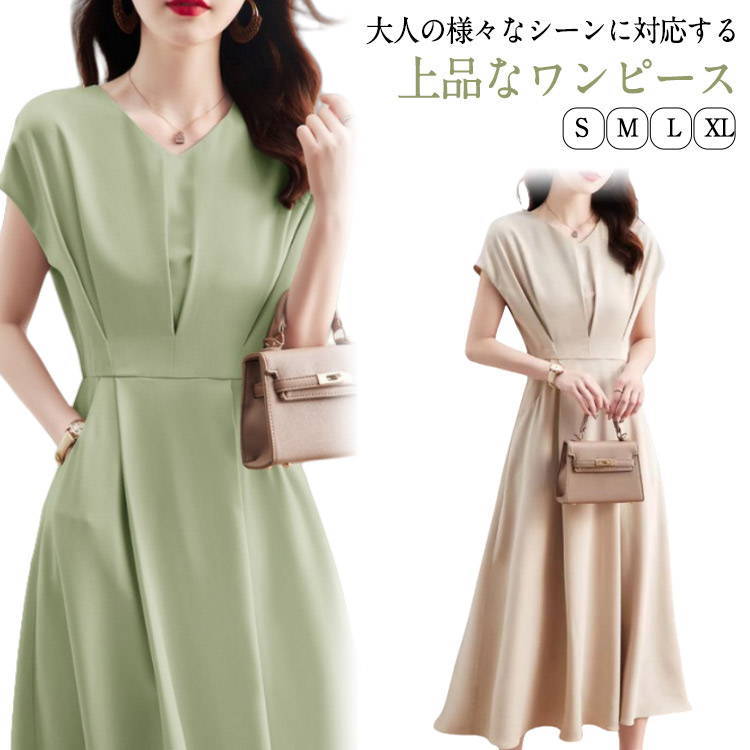 ワンピース 夏 レディース 半袖 Vネ レディースファッション 続々登場 グリーン アイボリー S M L XL