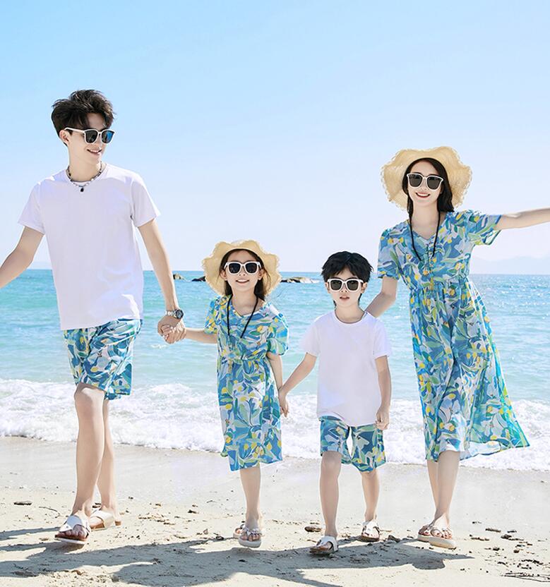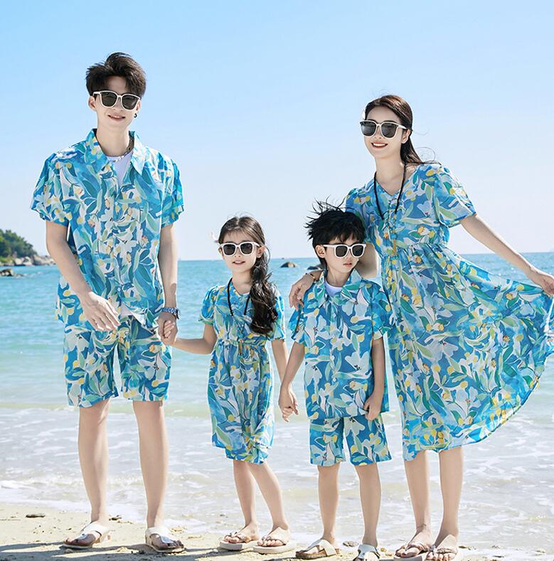 親子ペア 衣装 カップル 夏服 海旅行 ドレス シャツ+ブルー半ズボン シャツ+ベージュ半ズボン 白Tシャツ+ブルー半ズボン S M L XL XXL 3XL 4XL 90 100 110 120 130 140 150 160