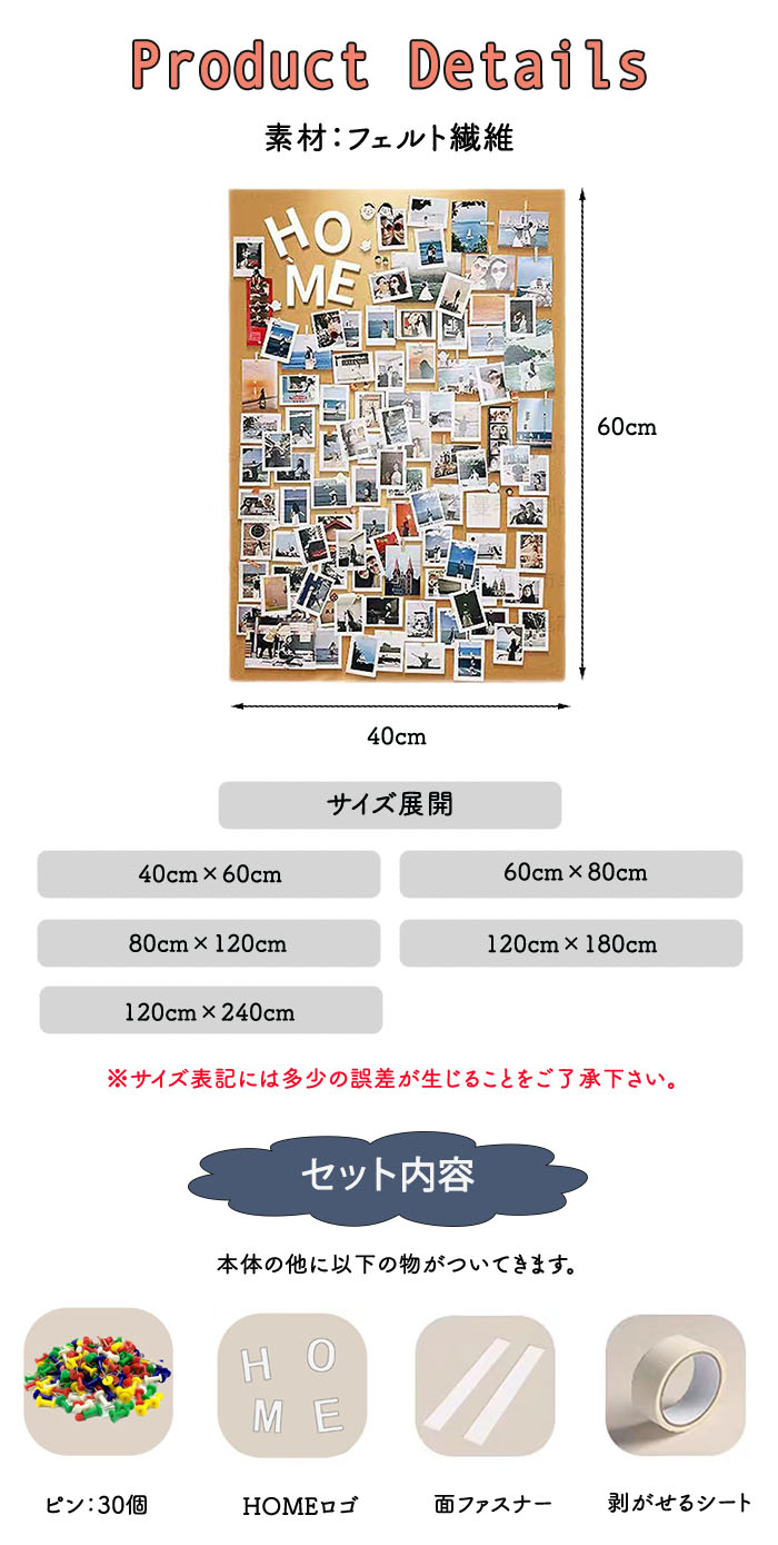 検索関連キーワード(商品の説明ではありません):フェルトボード 壁掛け 写真 穴不要 サイズオーダー可能 DIYボード 掲示板 多機能 写真壁 案内板 フォトフレーム フェルト製 ウェルカムボード ハリペタ 壁貼りフォトフレーム ウェルカムボード 伝言板 ポスター 画鋲付 写真立て スケジュールボード