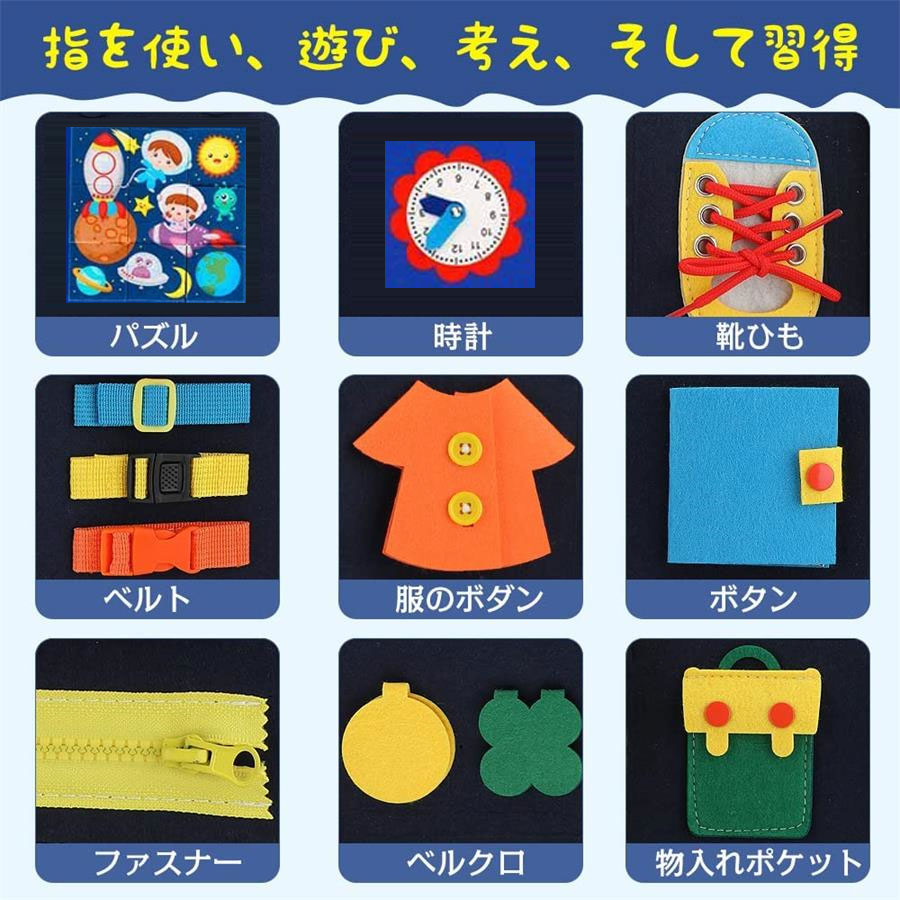 豊かなボタン、バックル、靴紐、ジッパーなどで遊べる、「ビジーボード」と呼ばれる知育用玩具です。一般に洋服についている留め具をまとめてあるオモチャで、子供の知力、創造性を刺激し、能力の開発に役立ちます。