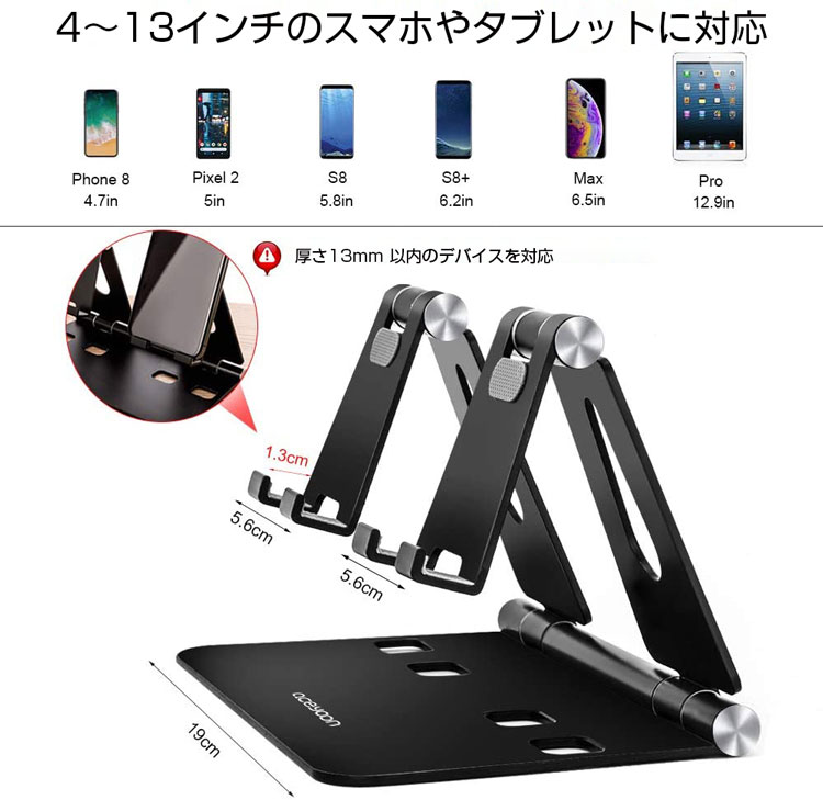 4~13インチのスマホやタブレットを対応します。更にスマホ二つを同時に使用可能。広げられたフックは厚さが0.6in/1.3cm以内のディバイスに適用します。カバーが付いたスマホも普通に使えます。iPhone 11 pro max XR / Xs / Xs Max /iPhone X / 8 / 8 Plus / 7 / 7 Plus / 6S / 6S Plus / 6 / 6S、ipad Pro 11 9.7 2017 2018、 Air、 mini、 Samsung galaxy s20、huawei mate30 p40 pro Xperia 1などに適します。