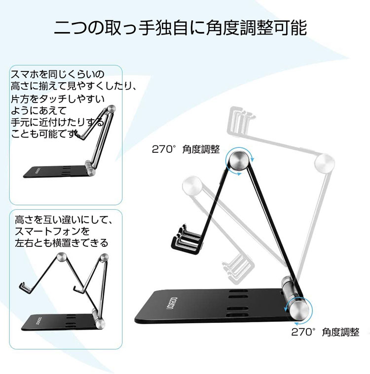 タブレットスタンド 折りたたみ 角度調整可能 スマホスタンド 卓上 スマホホルダー 2台置き アルミ製 充電スタンド ipad充電スタンド Pro 9.7 mini Air 11