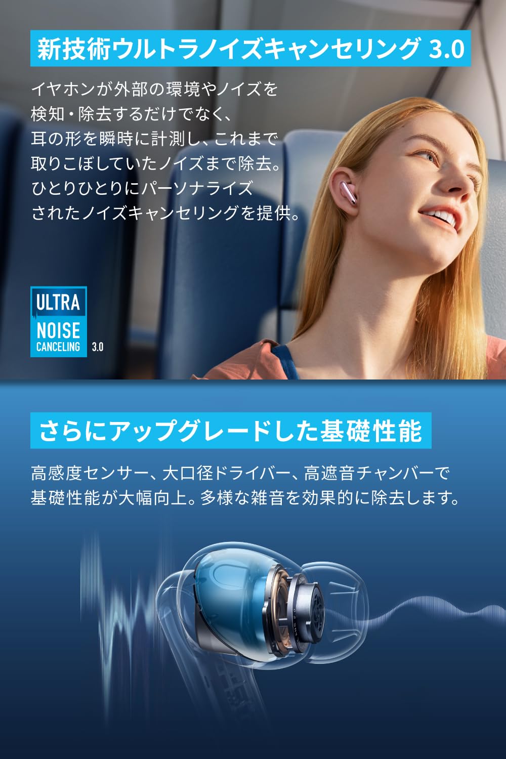 ウルトラノイズキャンセリング 3.0:イヤホンが外部のノイズを検知・除去するだけでなく、耳の形を瞬時に計測し、これまで取りこぼしていたノイズまで除去。パーソナライズされたノイズキャンセリングを提供。