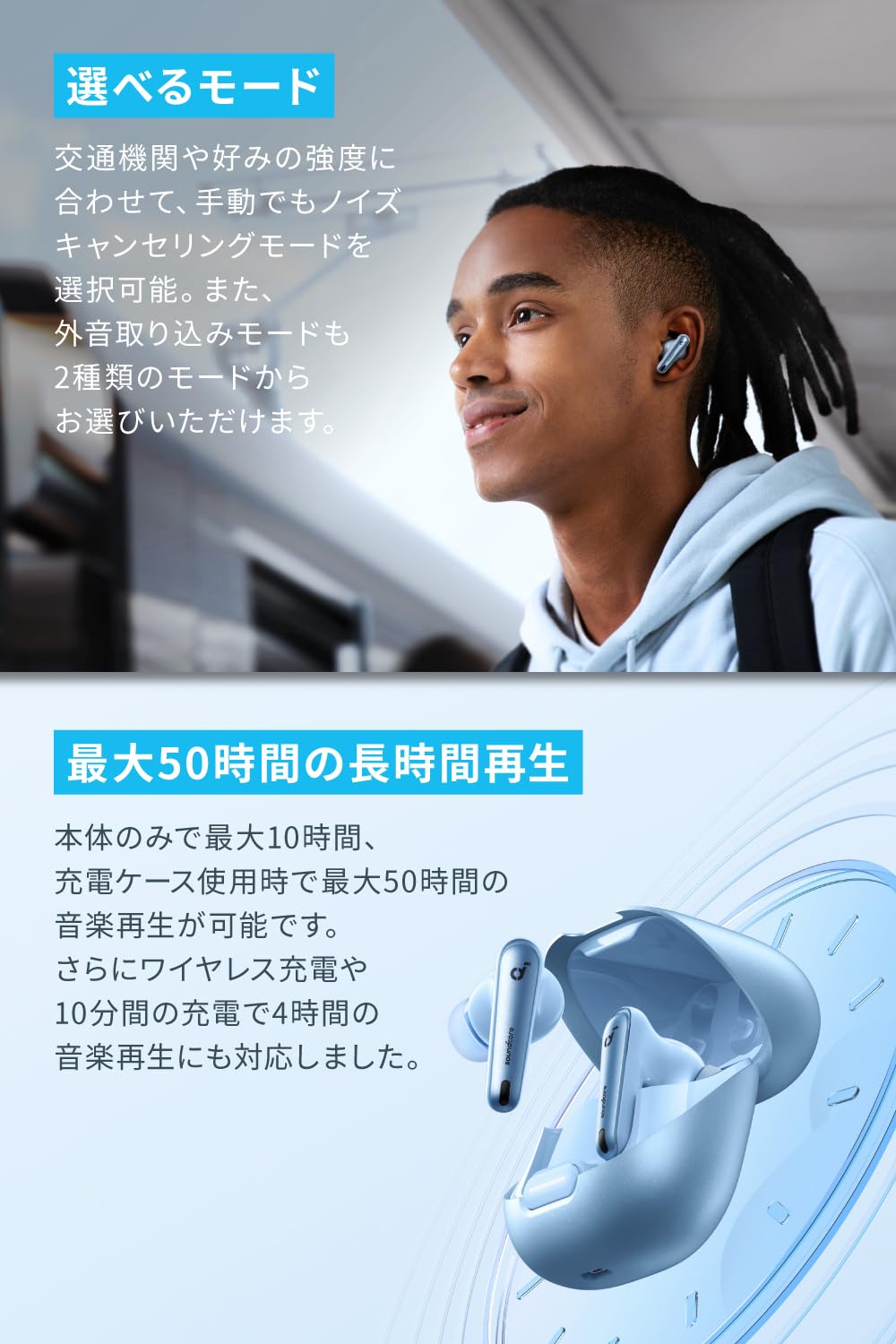 通常モード:最大10時間(イヤホン本体のみ) / 最大50時間(充電ケース使用時)