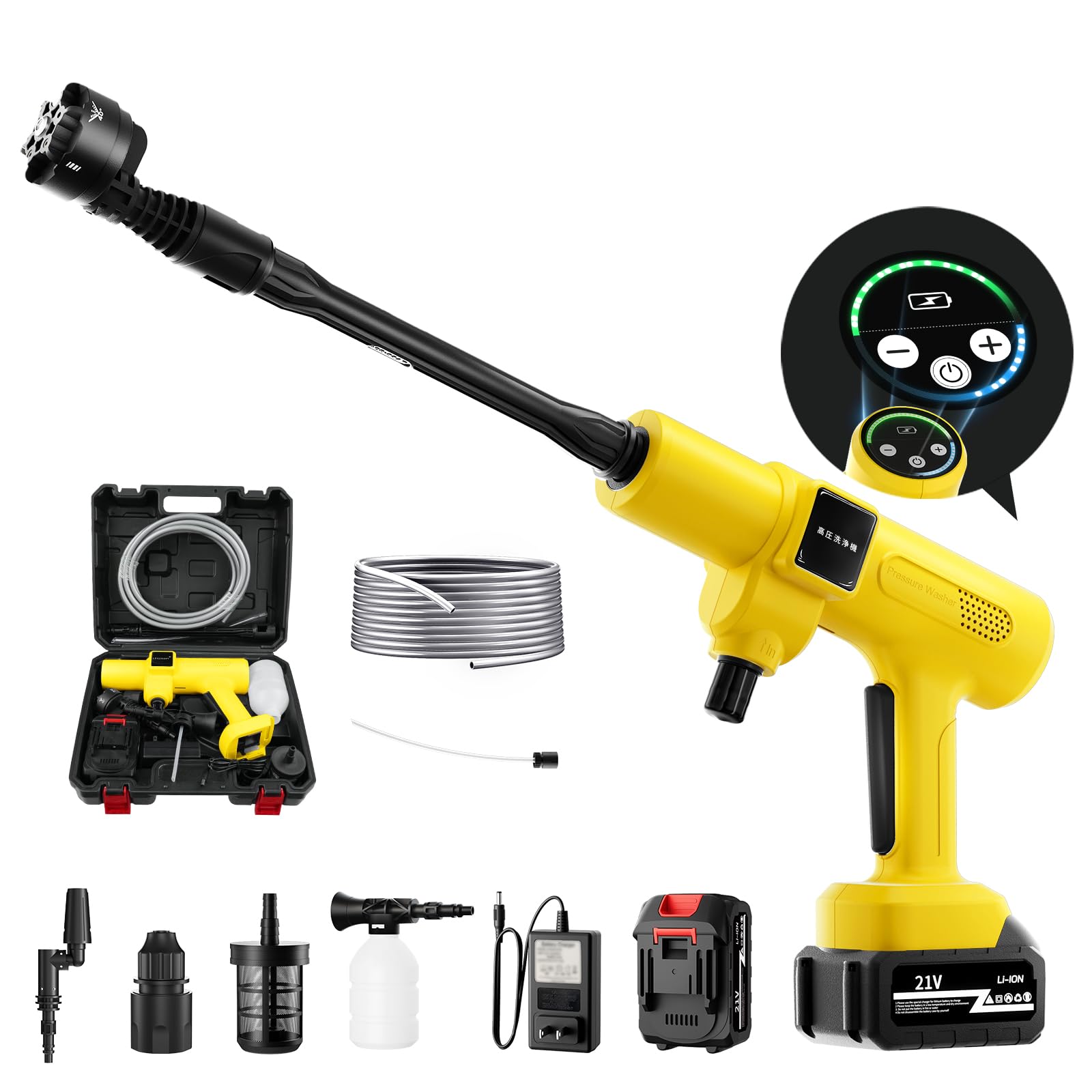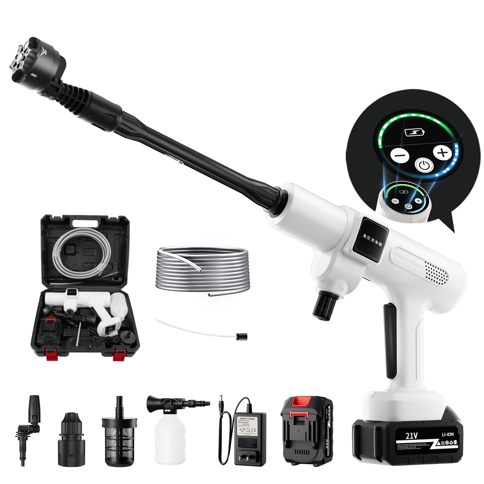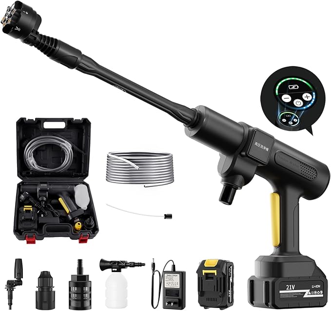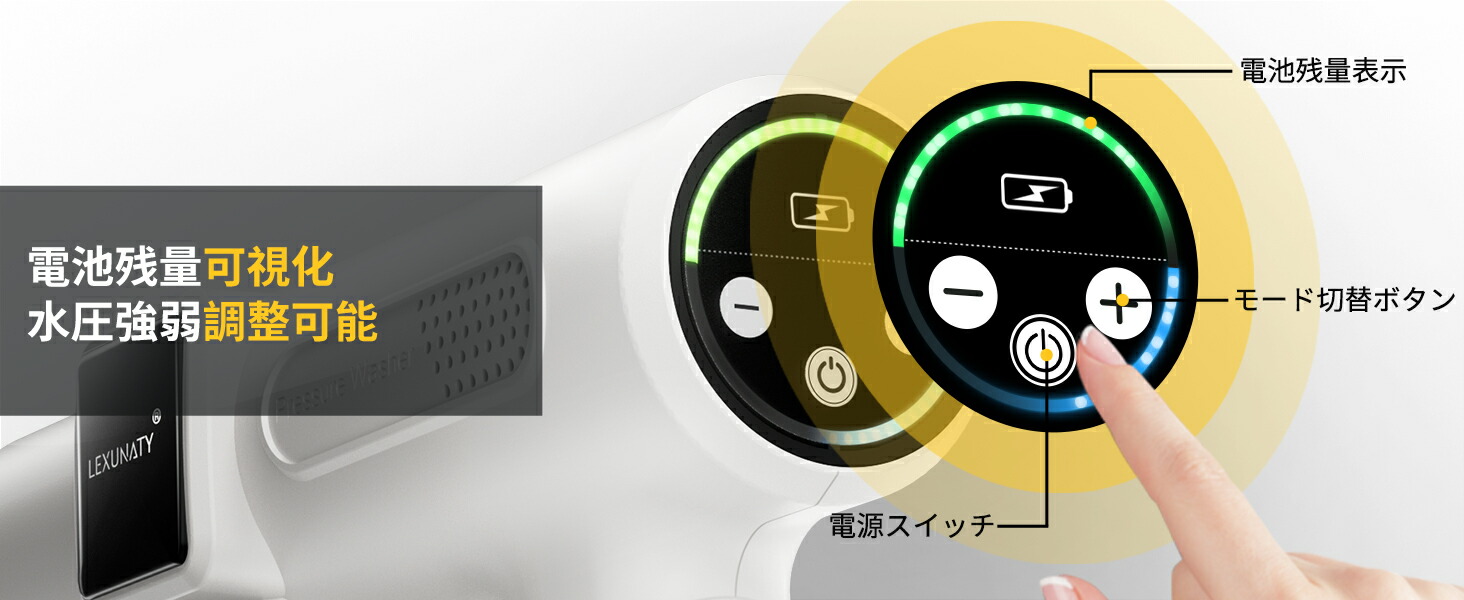 洗車用高圧洗浄機は一目でわかるディスプレイ画面搭載、画面の表示により、モード調整や電池残電確認ができます。750W最上クラスのブラシレスモーターを採用して、ハイパワーが実現され、しかも省エネ!低騒音デザインの高圧洗浄機で、水圧を調節できる家庭用モデルなので洗車だけじゃなくさまざまな汚れをラクに掃除!網戸のほこり花粉を洗い流したり、外壁の苔を除去したりと、用途はさまざま。 弾力性があるので洗浄作業中も楽々給水ホースに専用フィルターを利用し、ゴミなど不純物の混入を防ぎます。駐車場の泥汚れや玄関のコケなど、屋外のしつこい汚れにもおすすめです。「ご注文:この製品はテスト後に出荷しているので水分が多少残っている場合はありますが製品の性能に問題はありません。」