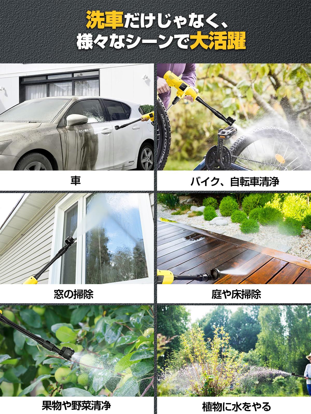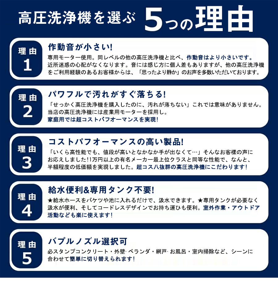 ブラシや雑巾といったほかの掃除道具と異なり、水を当てるだけなのでラクに掃除ができる点が大きな魅力です。2段階水 モードがあり、射程は最大10メートル、強力な水圧によって、長年蓄積したガンコな汚れを落とすことにもできます。オプションパーツは豊富で、自吸機能つきで汎用性が高く、小型のため持ち運びやすく、射を切り替える6in1ノズルや、洗車に便利な左右360°上下180°変換ノズル、フォームノズルが付き、扇型の水流で効率よく洗浄できます。車の下回り雨どいなどの手の届きにくい場所の洗浄に適しています。一方、高圧ホースは接続しやすく、ノズルの先端を回転させることで6種類の水流を使い分けられる点は様々なシーンで大活躍!洗車や庭、屋外、階段、網戸窓ガラス、ブロック塀、外壁、駐車場、玄関まわり、自転車バイク、ベランダ、高い場所、家まわり、浴室、年末大掃除、キャンプ用品の清掃やBBQの片付けにも大活躍。