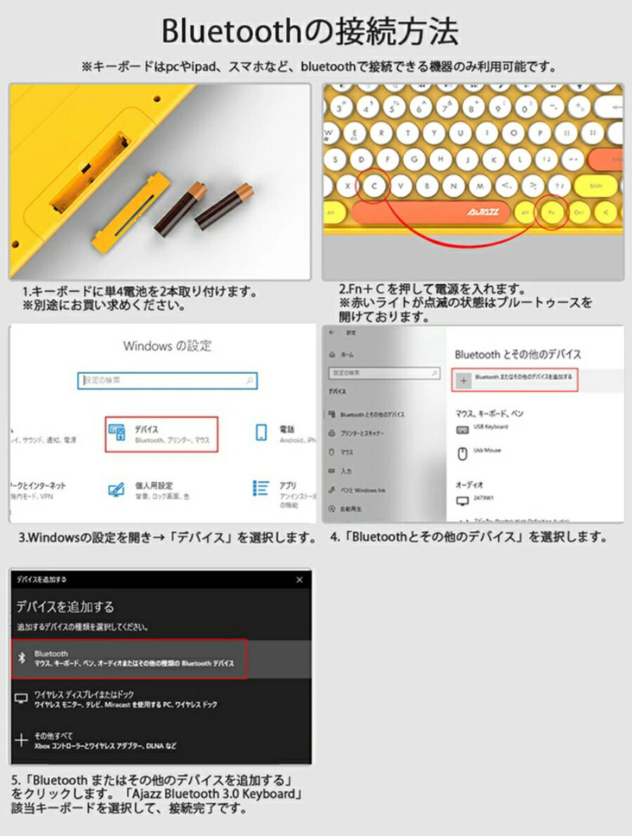 PCの場合は、 「スタート」ー「設定」ー「デバイス」を選択し、「Bluetoothまたはその他のデバイスを追加」をクリックし、最後は「Ajazz Bluetooth 3.0 keyboard」を選択して完了。
