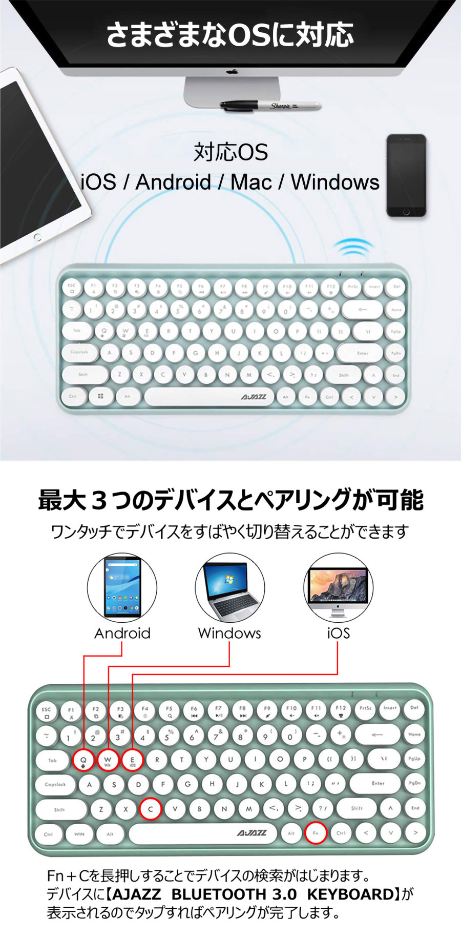 【幅広い互換性】 Windows7 /8/10 /XP、Mac OS、iOS、Androidに対応します。様々なデバイスとBluetoothを接続して使えるポータブルタイプのキーボードです。