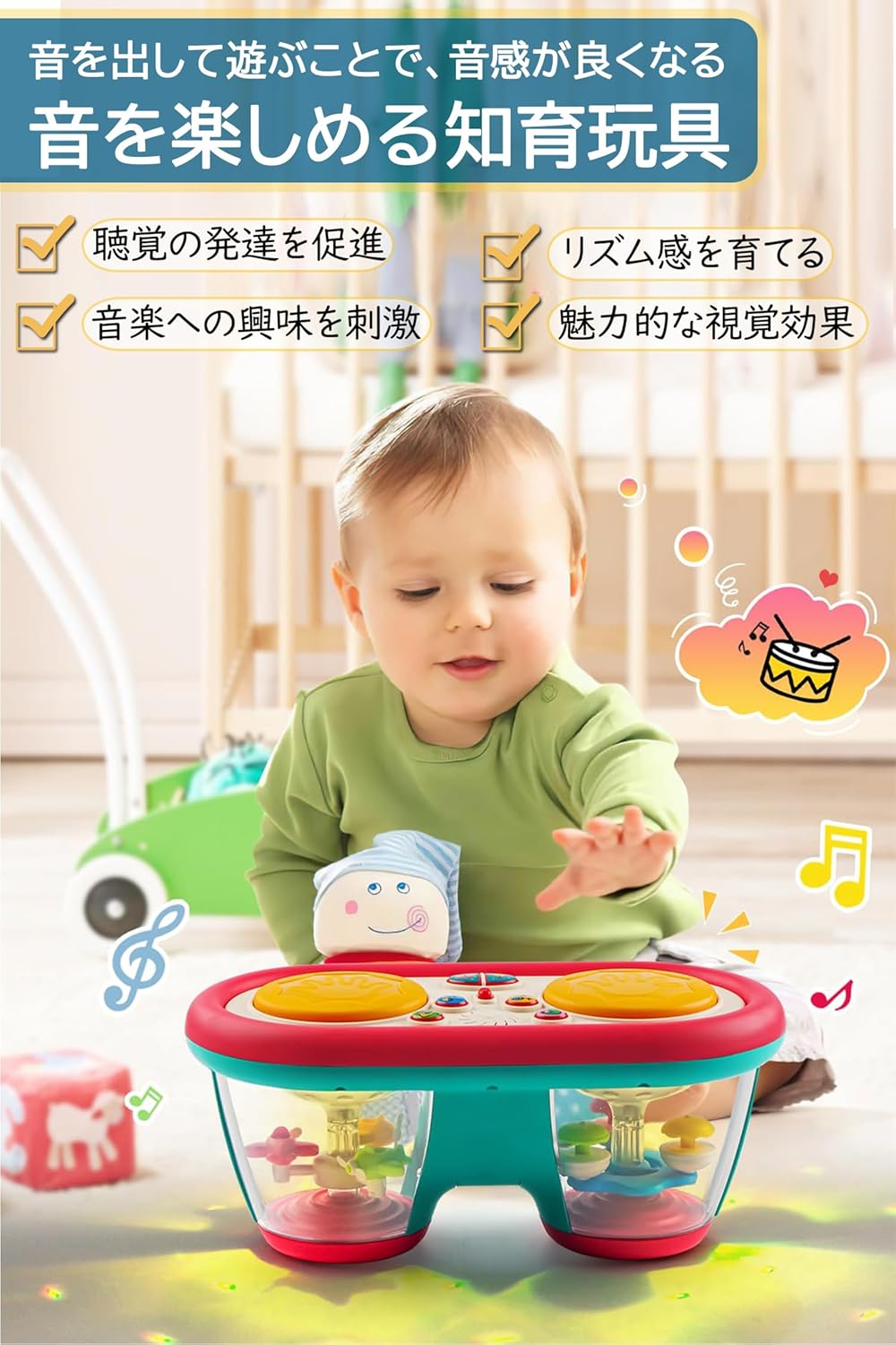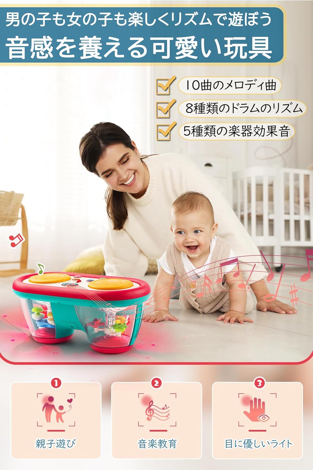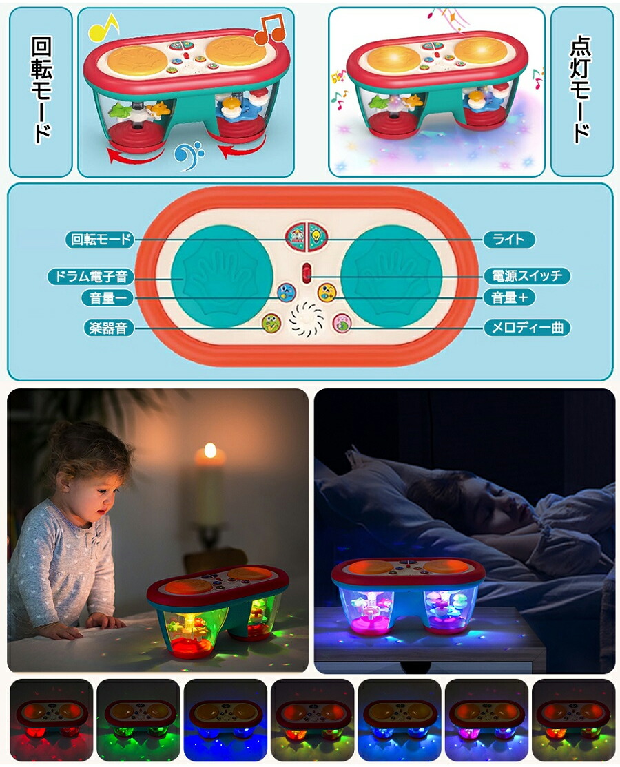 モンテッソーリ おもちゃ ドラム 赤ちゃん 楽器 知育おもちゃ 早期開発 指先訓練 音の出るおもちゃ 音楽おもちゃ 8色回転ライト 8種類楽器効果音 モンテッソーリ教具 女の 10曲メロディ