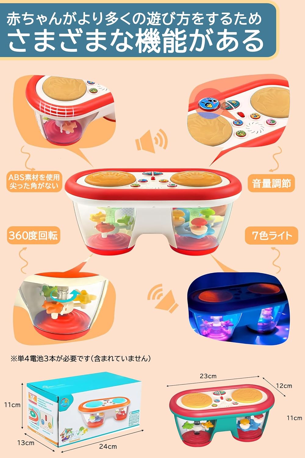 7色のライトの切り替えができます、子供の目を引き付ける回転照明機能もあります。魅力的な視覚効果を作り出し、子供の興味を引き付け、玩具への興味を高めます。