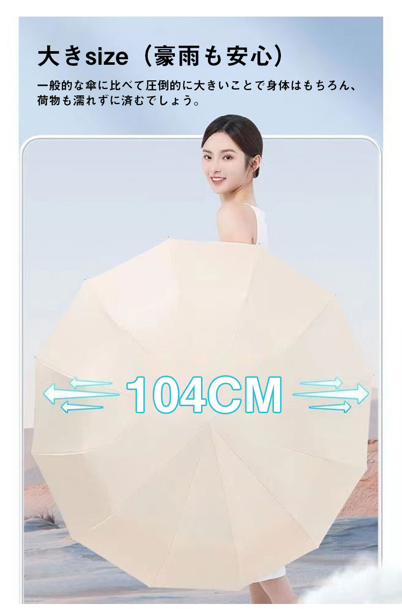 開く直径が104cmです。大きいサイズなので豪雨にも余裕で耐えられます。男女老若を問わず、通勤、通学、旅行、出張などの場合がご利用できます。