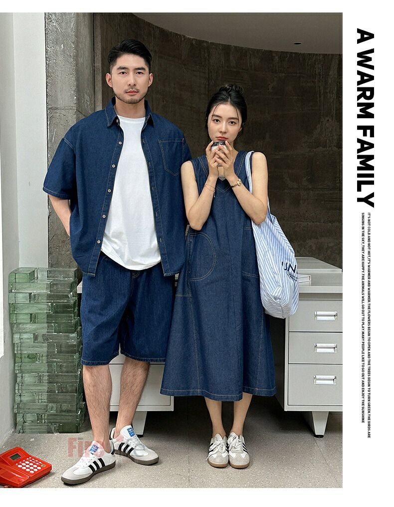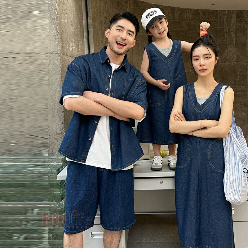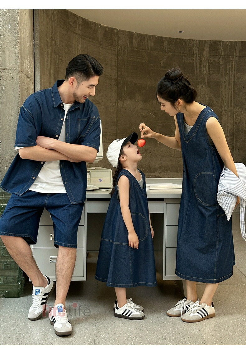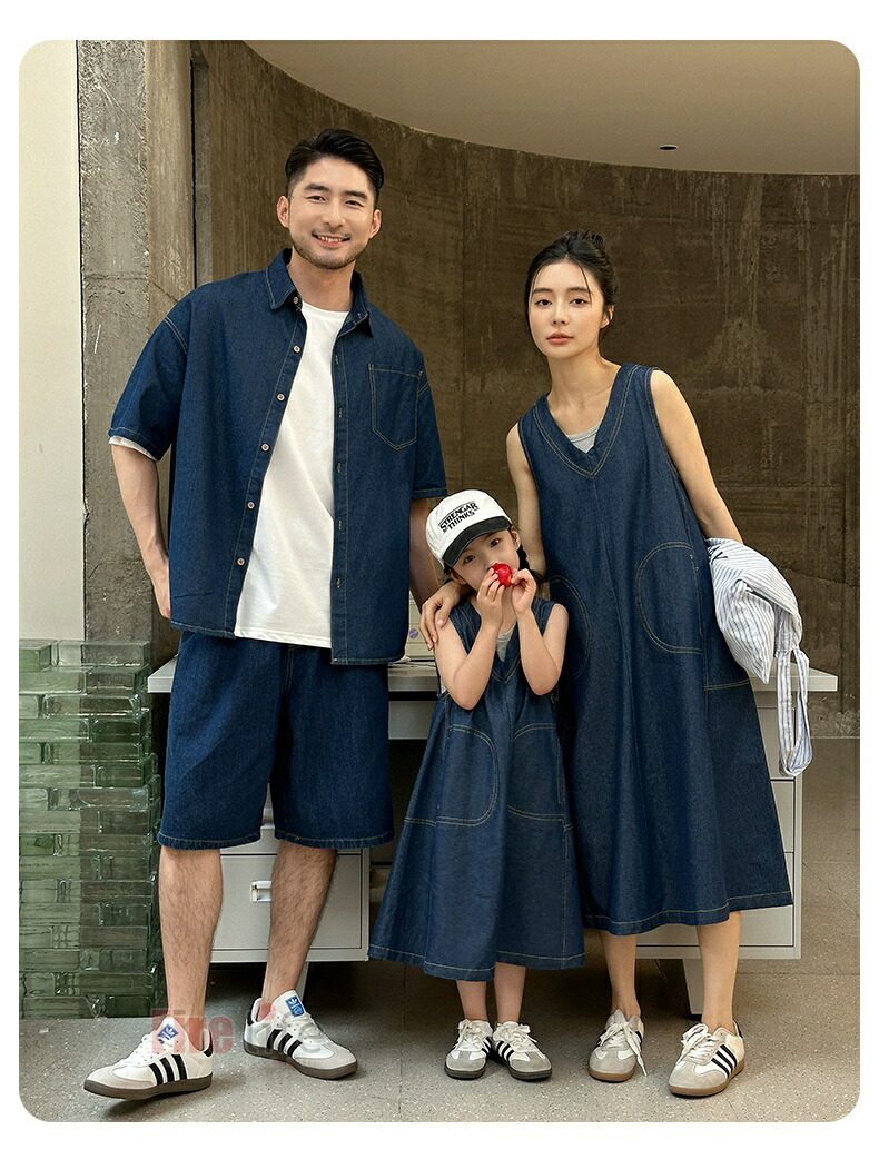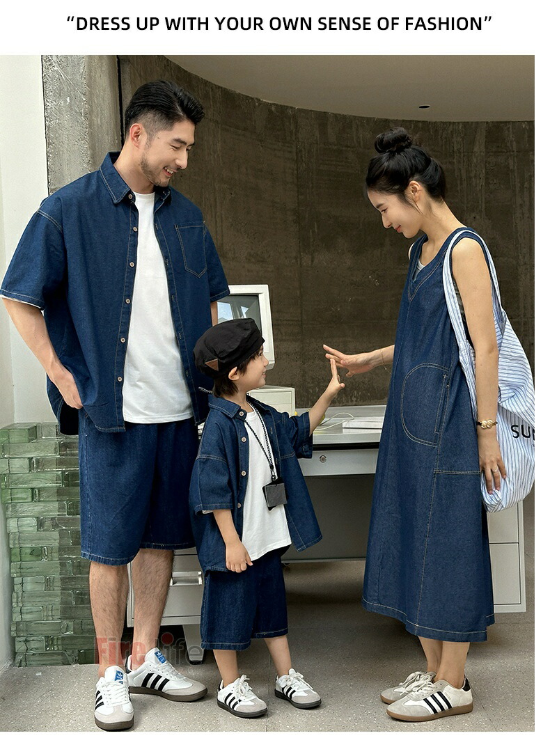 リンクコーデ 親子ペアルック 親子でお デニムシャツ ワンピース デニムシャツ+短パンツ 80 90 100 110 120 130 140 150 大人S 大人M 大人L 大人XL 大人2XL 大人3XL