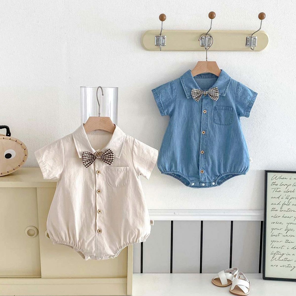 ベビー ロンパース フォーマル 男の子 蝶ネクタイ付き 襟付き 半袖 夏用 夏服 赤ちゃん デニム コットン 子供服 お食い初め 服 衣装 キッズ 綿 新生児 66 シャツ