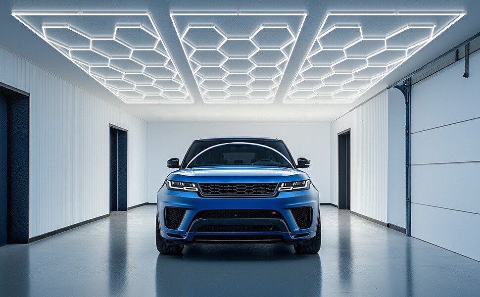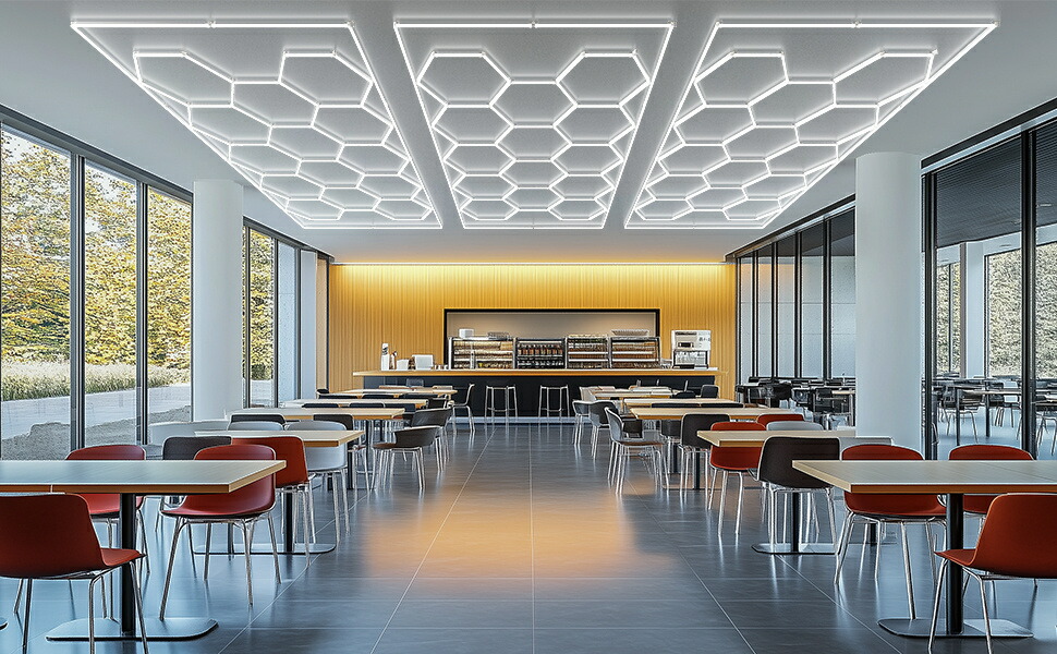 【六角形灯 個性的なシルエット】一般的なシーリングガレージライトとは異なり、六角形ライトはより鮮やかなグラフィックで、視覚的に斬新な印象を与えるだけでなく、より広く均一に照らすことができます。 ハニカムライトはガレージや作業場だけでなく、ショールームや会議室などでもお使いいただけます。