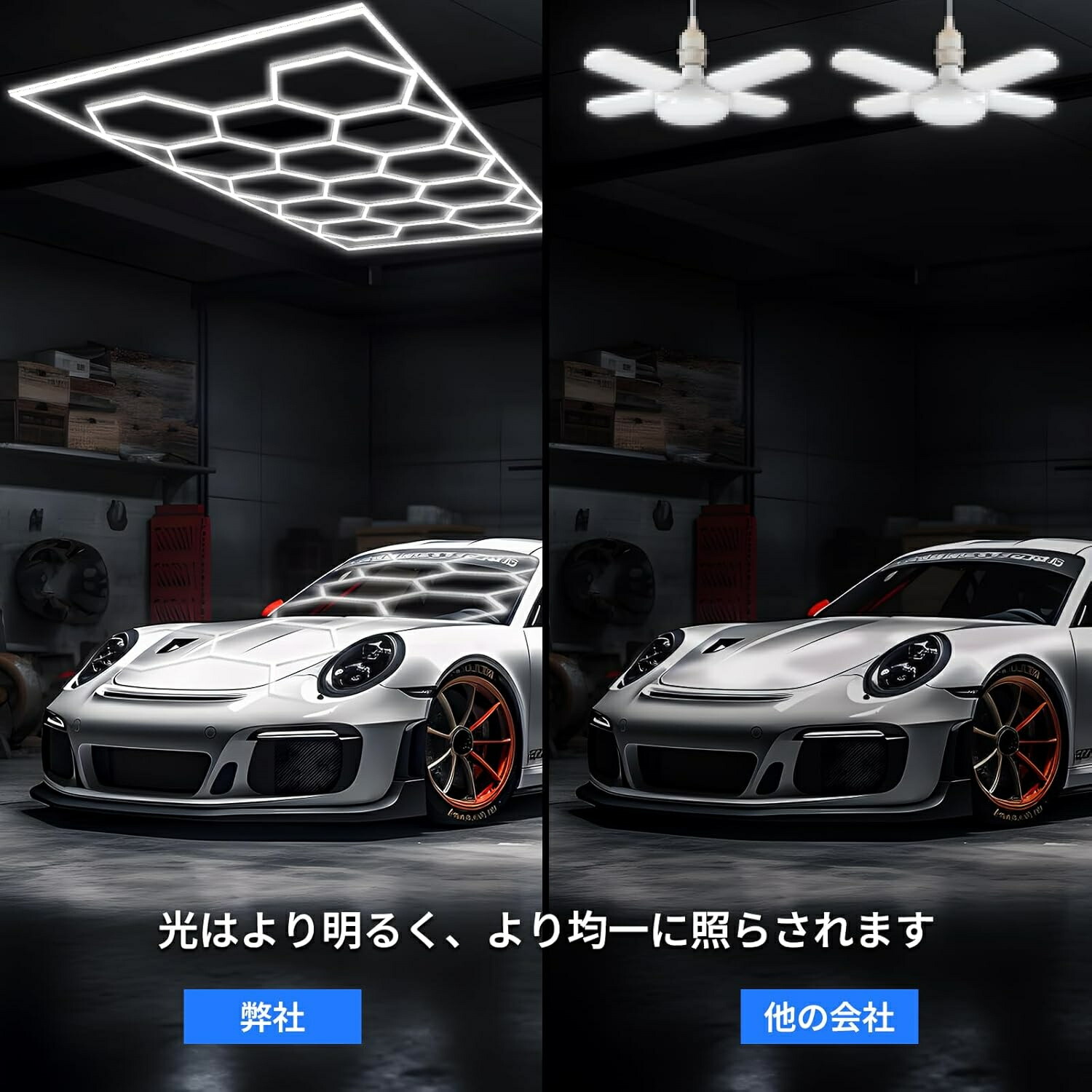 【明るい 高輝度】LEDガレージライト光束最大120LM/W、演色評価数85以上のLEDライトと標準色温度6500kは、ガレージでの作業に適した空間だけでなく、オフィスや展示会に適した明るい環境を作り出します。