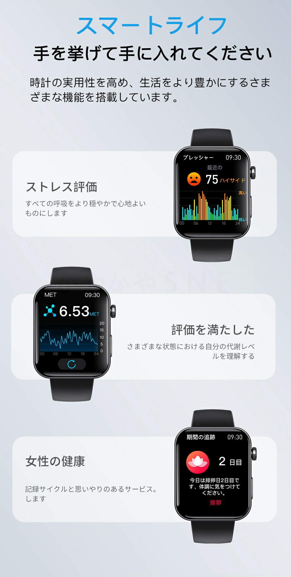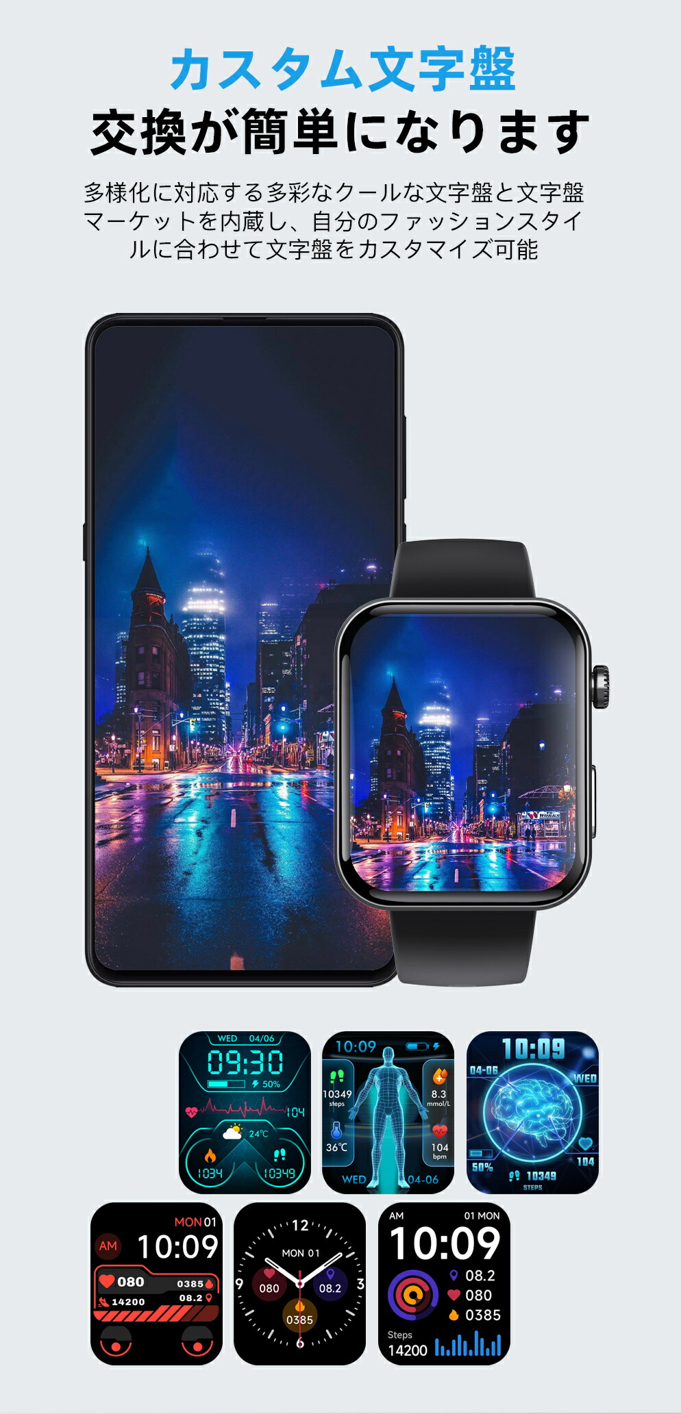 2.1インチのカラー スクリーンを搭載し、時間やメッセージなどの内容がよりり鮮明に表示され、自動輝度調整機能が付き、どんな場所でも見やすいスマートウォッチ。