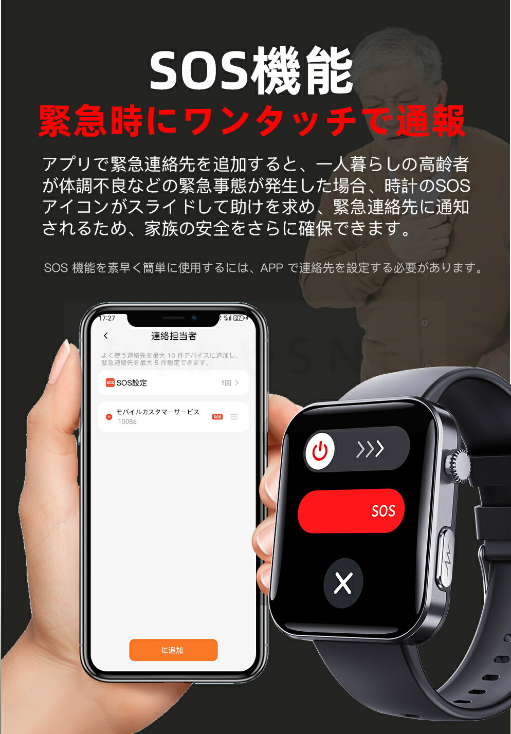 スマートウォッチ 緊急 SOS機能付き 日本製センサー 敬老の日 IP67 防水 大画面 通話機能 心拍数 管理 モニター 歩数計 SOS 音声通話 音楽再生 ヘルスケア LINE メッセー 健康管理