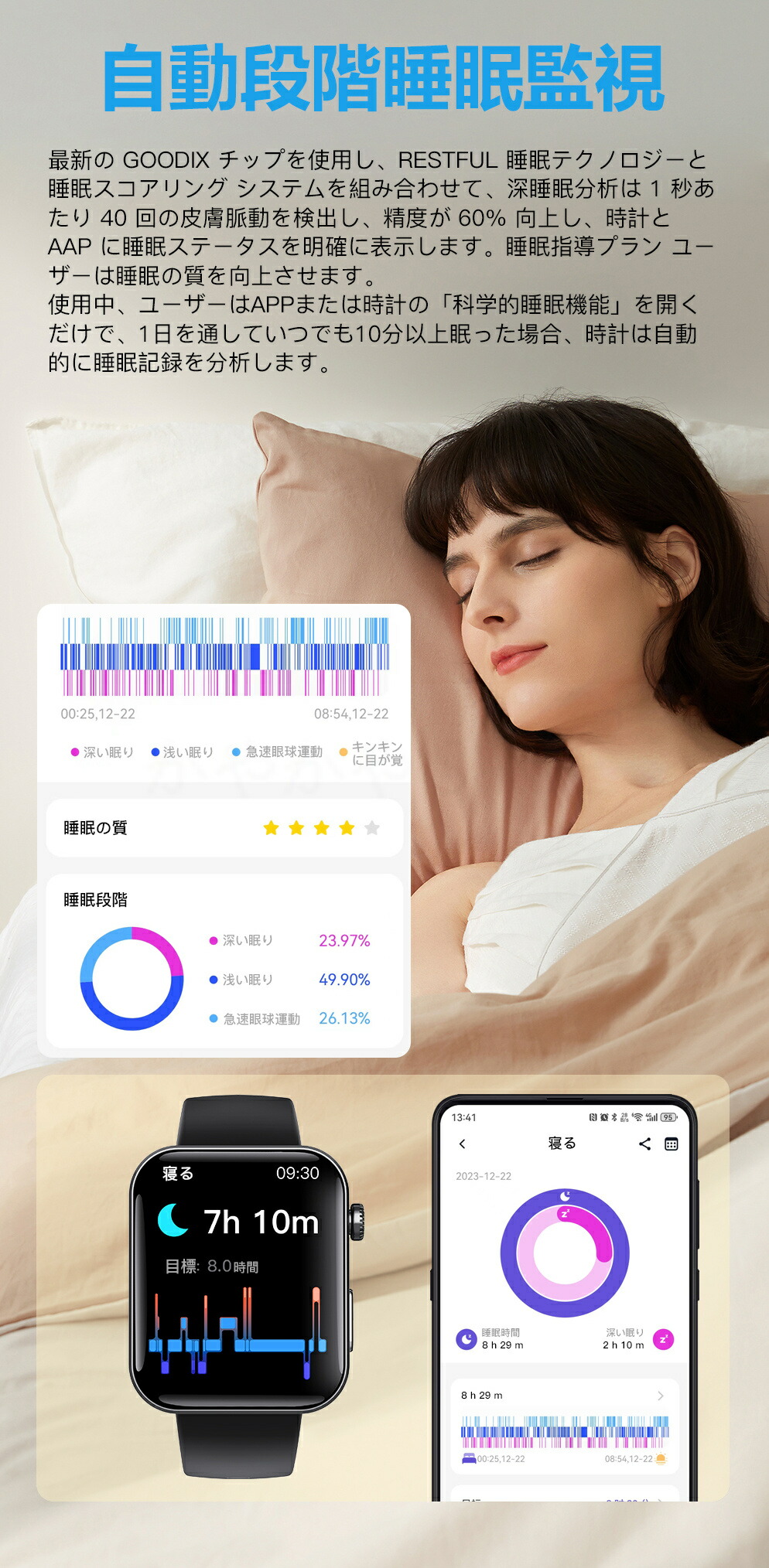本活動量計で歩数、消費カロリー、距離などのデータを記録し、合理的に運動量、運動時間を管理することができます。また、睡眠データを記録でき、睡眠の質を計測可能となり、睡眠パターンの調整に活用できるスマートブレスレット。他にも着信通知、輝度調整、カメラ遠隔、スマホ探す、ストップウォッチ、アラーム、座りすぎ通知、腕上げ点灯などの機能があります。スポーツ性、ファッションと実用性を備え、クリスマス、新年、誕生日、記念日、父の日、母の日、敬老の日などに最適なプレゼントです。
