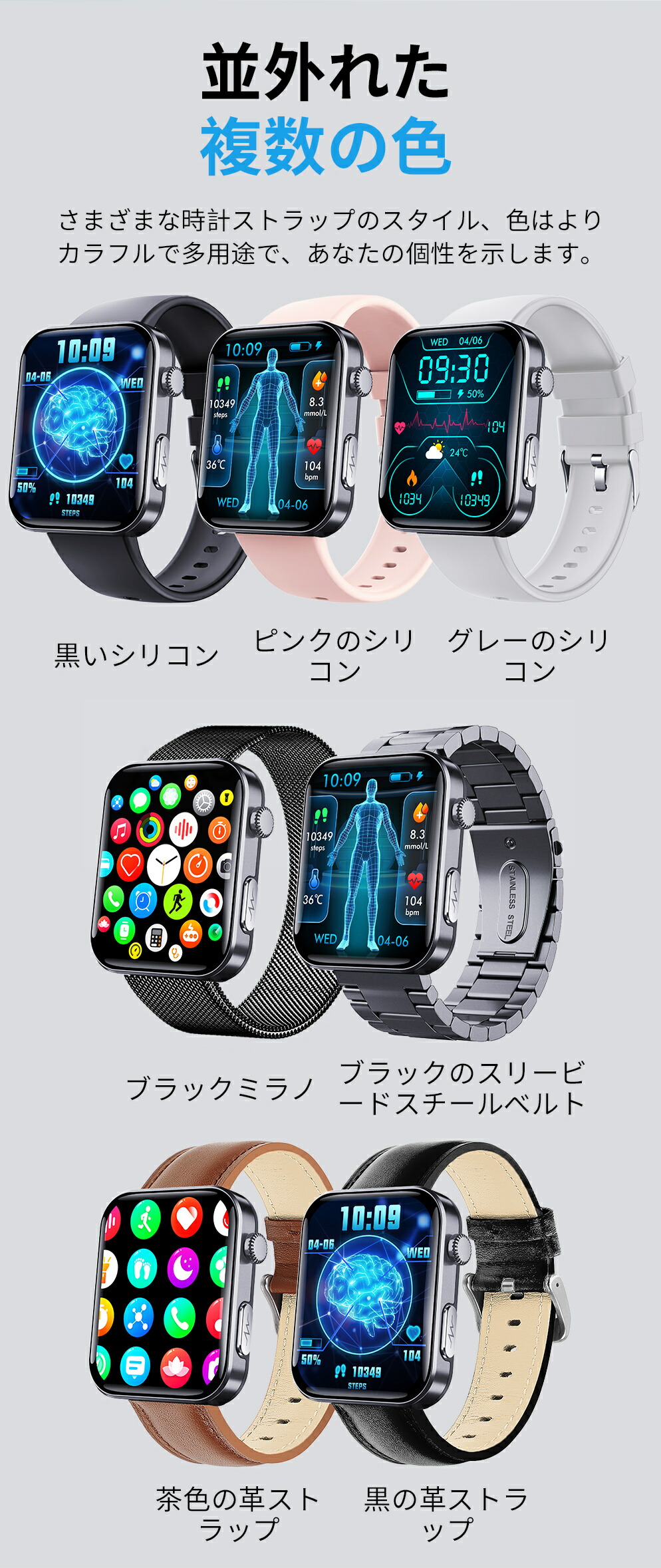 スマートウォッチ 緊急 SOS機能付き 黒いシリコン ピンクのシリコン グレーのシリコン ブラックミラン ブラックのスリービードスチール 茶色革ストラップ 黒革ストラップ