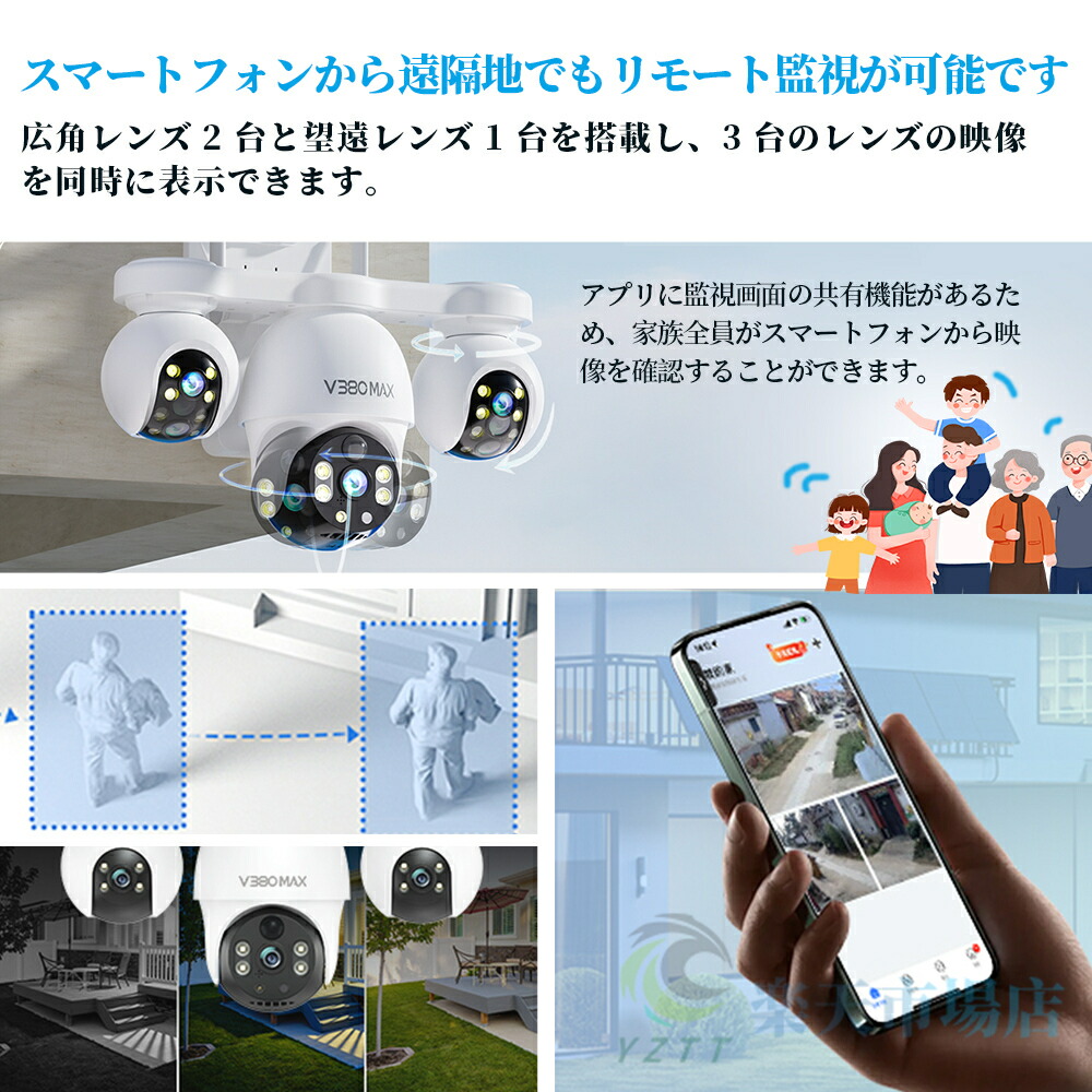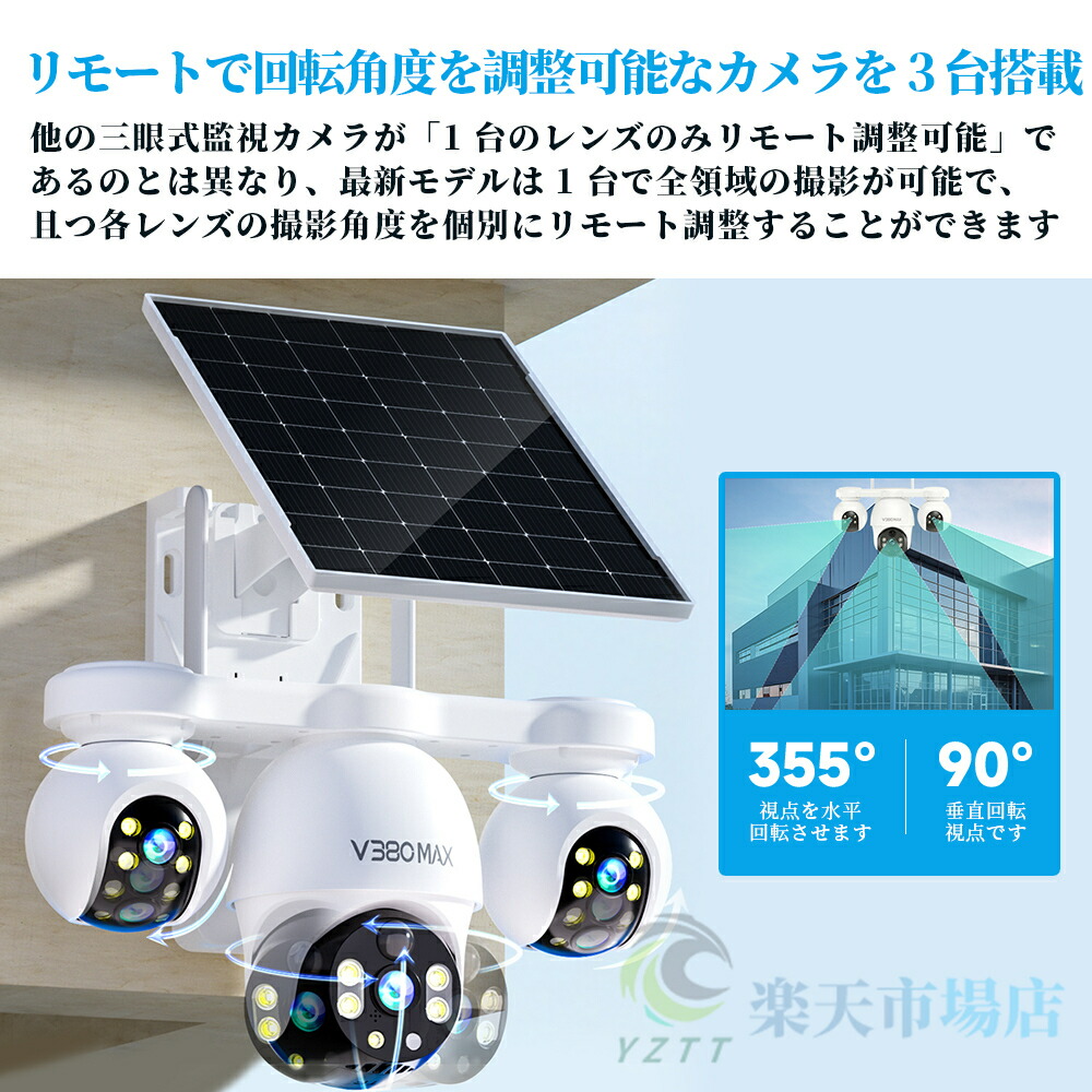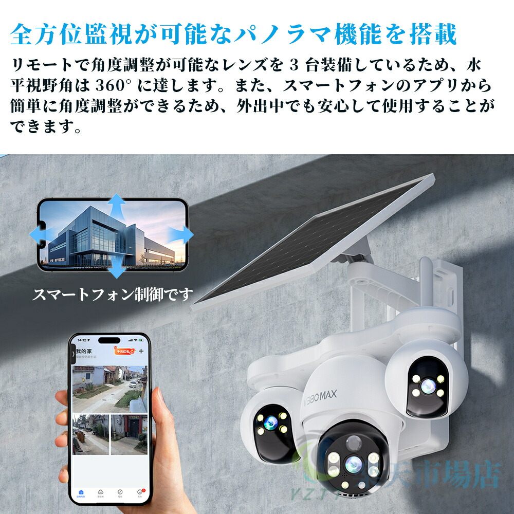 この屋外監視カメラは 3 つのカメラを搭載しており、各カメラはスマートフォンから遠隔で個別に角度調整が可能です。また、3 つの監視画面を同一画面に表示できるため、複数の監視箇所を同時に確認するのに便利です。