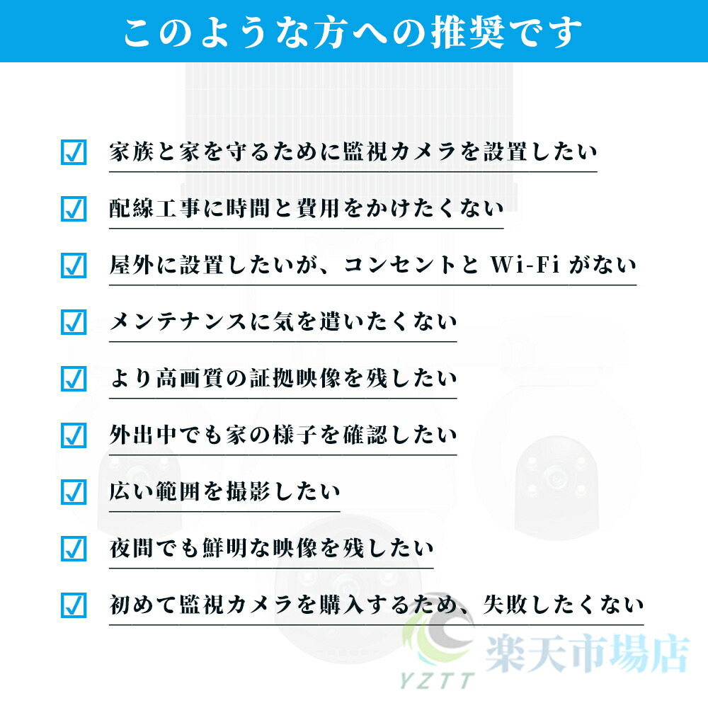 このワイヤレス屋外防犯カメラは単結晶ソーラーパネルを搭載し、光電変換効率は 19.5% に達し、ワイヤレスカメラに持続的に電力を供給し、365 日年中無休で稼働することが可能です。デバイスには 8000mAh の大容量バッテリーが内蔵されているため、電源接続は不要で、設置時の配線の手間を省け、玄関、カーポート、庭など電源から離れた場所でも便利に使用できます。