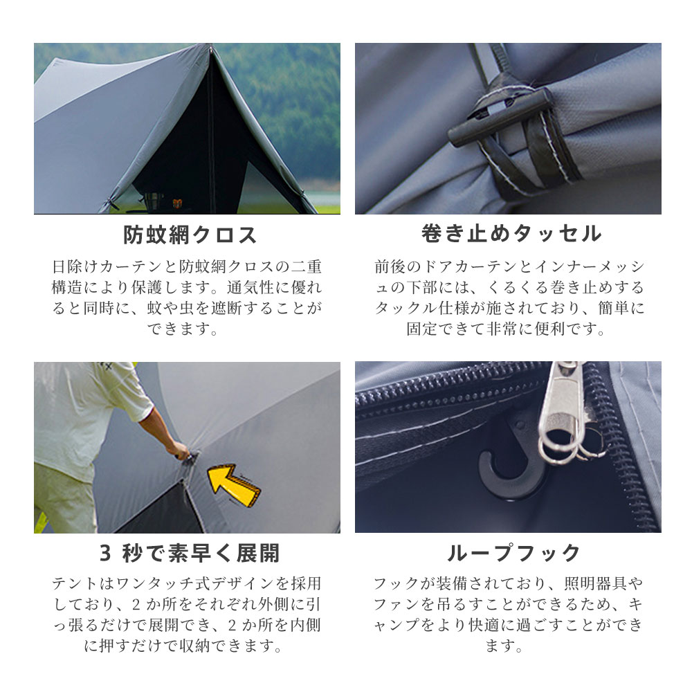 通気性がよく-- テントの前後にドアと窓が配置されます。また、前後左右の抜群な通気性、よい通気性を保証します。居心地よいのテント生活をもたらします,いメッシュ生地を採用し、蚊など虫の侵入を防ぎながらテント内にも快適にしてくれます。