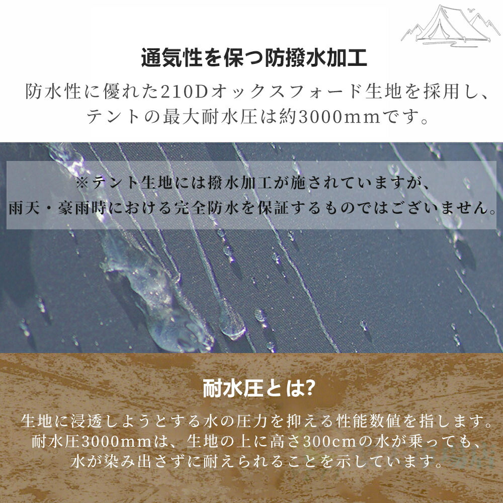 テントの生地には耐水圧の撥水素材を使用。急な天候の変化にも慌てない!小雨程度なら問題なく使用できる防水性能です。