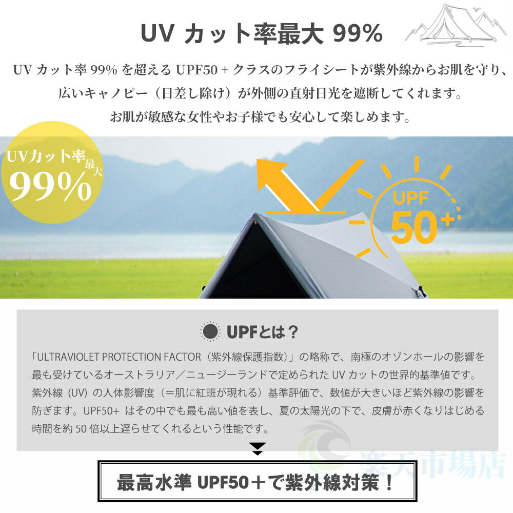テント生地にUVカット加工を施しているため、お肌が敏感な女性やお子様でも安心して過ごすことができます。ペグとロープを使用したら防風力が大幅にアップします。優れた安定性があります。