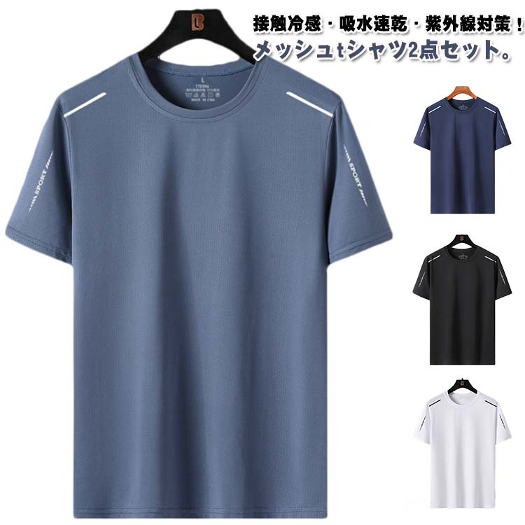メッシュ ランニング 吸汗速乾 夏用 クルーネック 涼しい 半袖 Tシャツ 接触冷感 UVカット メンズ トップス 作業服 作業着 2枚セット スポーツ