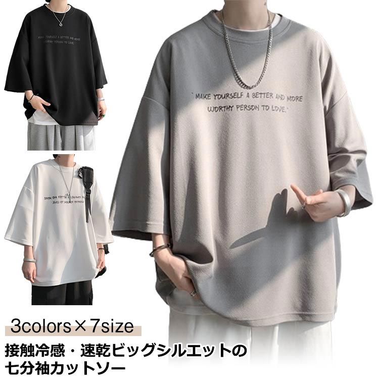 メンズ tシャツ 7分袖 ビッグ t シャツ オーバー サイズ 丸首 ビッグtシャツ 接触冷感 速乾 ドライ 涼感 カットソー 5分袖 クルーネック ビッグシルエット ファッション ルーズ 半袖 韓国