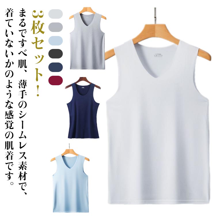 3枚セット タンクトップ 接触冷感 大きいサイズ メンズ シームレス 下着 インナー 夏 涼感 冷感 ノースリーブ 吸水速乾 薄手 無地 肌着 部屋着 レイヤード Vネック 見えない キャミ Uネック