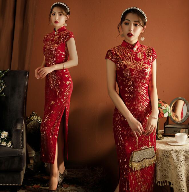スパンコール チャイナドレス ロング丈 マキシ丈 半袖 中華ドレス きらきら 中華服 中国風 パーティー 二次会 ドレス 結婚式 ドレス 中華風 演奏会ドレス 2 3 4