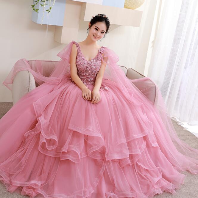 カラーウエディングドレス パーティードレス カラードレス 大人 マキシ丈 フリルドレス ピンク Vネック ノースリーブ 肩にロングフリルベール ボリューム ロングドレス 結婚式 二次会 お呼ば 立体花