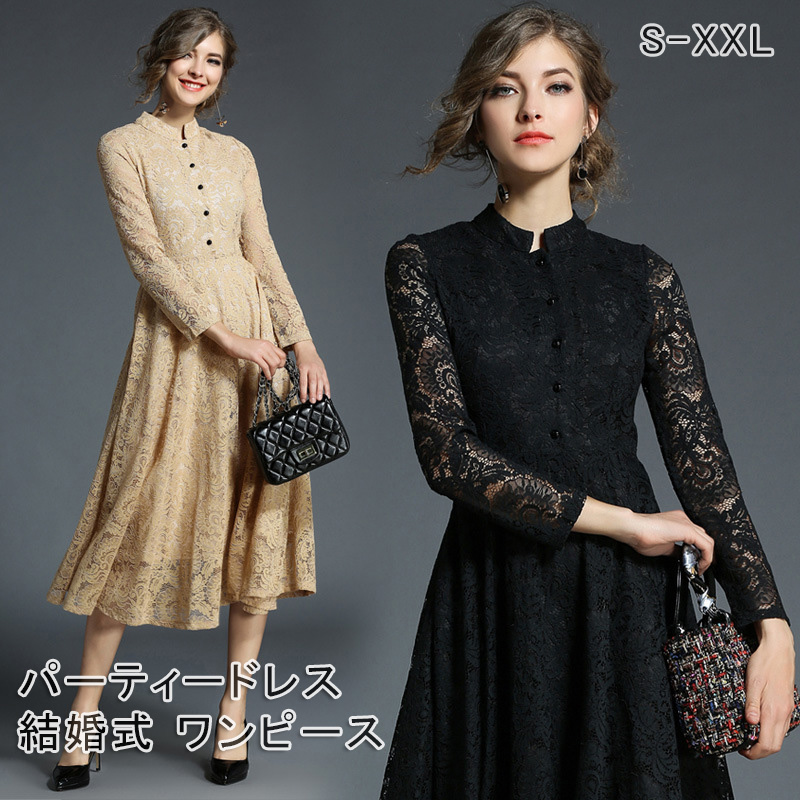 パーティードレス ミモレ丈 総レース 長袖 結婚式 ワンピース ロング 黒 ベージュ 大きいサイズXXL 入園式 二次会 謝恩会 同窓会 服装 大人 フォーマル 大きいサイ 発表会
