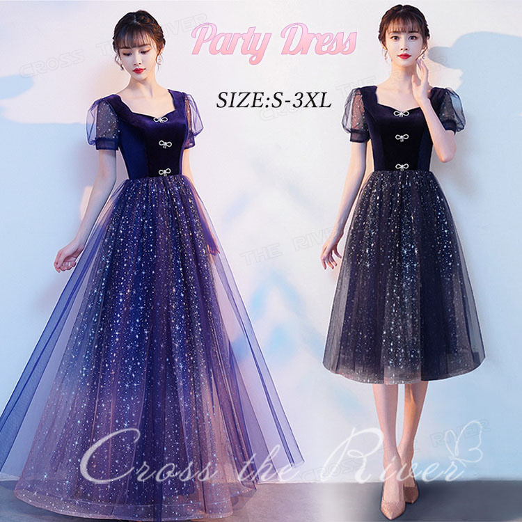大人 ピアノ発表会 高校生 ネイビー 韓国 パーティードレス ロングドレス 演奏会用ドレス カクテルドレス 中学生 カラードレス 二次会 花嫁 2色 スパンコール ウェディング パフ袖