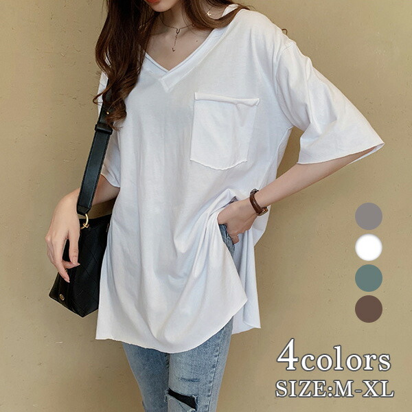 アースカラー Vネック ポケット Tシャツ 大きめ ゆったり オーバーサイズ 半袖 ブラウン トップス レディース ホワイト