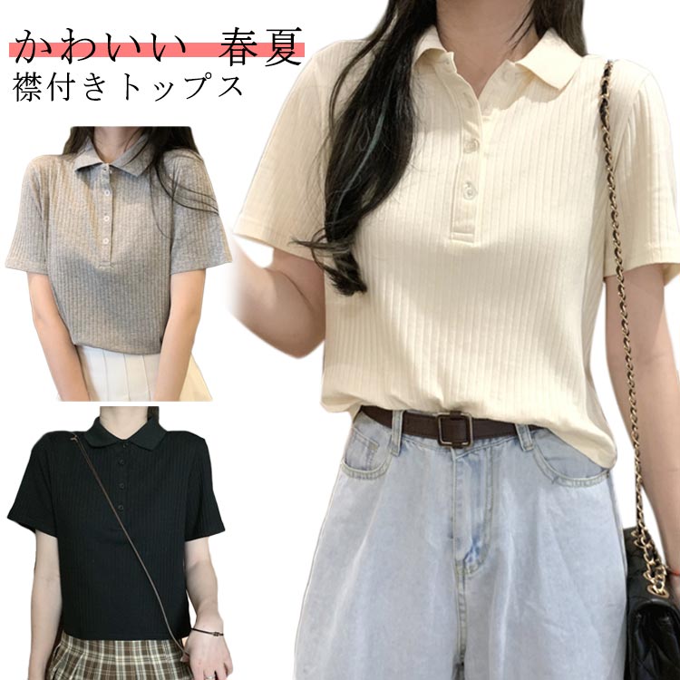 無 韓国ファッション 女の子 カジュアル リブ 短丈 カットソー 半袖 夏 春 Tシャツ ショート丈 ポロシャツ 襟付きトップス