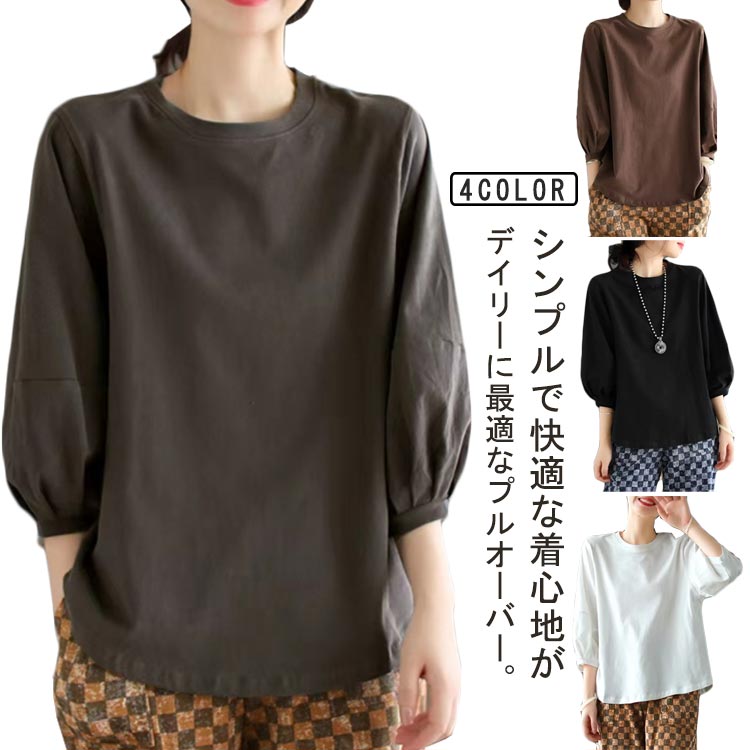 シンプル カットソー 7分袖 クルーネック レディース トップス ボリュームスリーブ ぽわん袖 七分袖 プルオーバー 無地 Tシャツ ゆったり 長袖tシャツ 春 秋 カジュアル パフ袖 夏