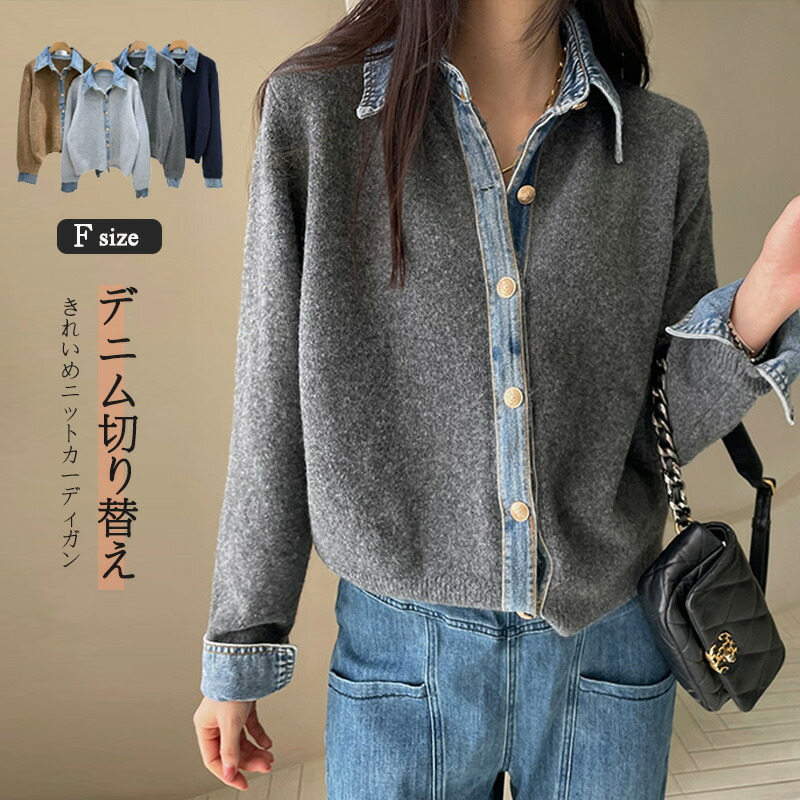 【一部短納期】カーディガン レディース ニット ニットカーディガン ニットカーデ デニム デニム切替 トップス 羽織り ジャケット 長袖 前開き 無地 秋