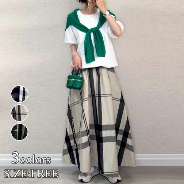 チェック ロングスカート ワイド ゆったり きれいめ カジュアル 可愛い 長袖 秋 冬 春 トレンド 大人可愛い ボトムス レディース