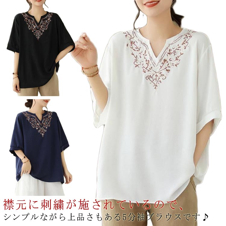 トップス 春 シャツ 刺繍 半袖 五分袖 レディース プルオーバー 薄手 ゆったり 大きいサイズ 夏 ブラウス