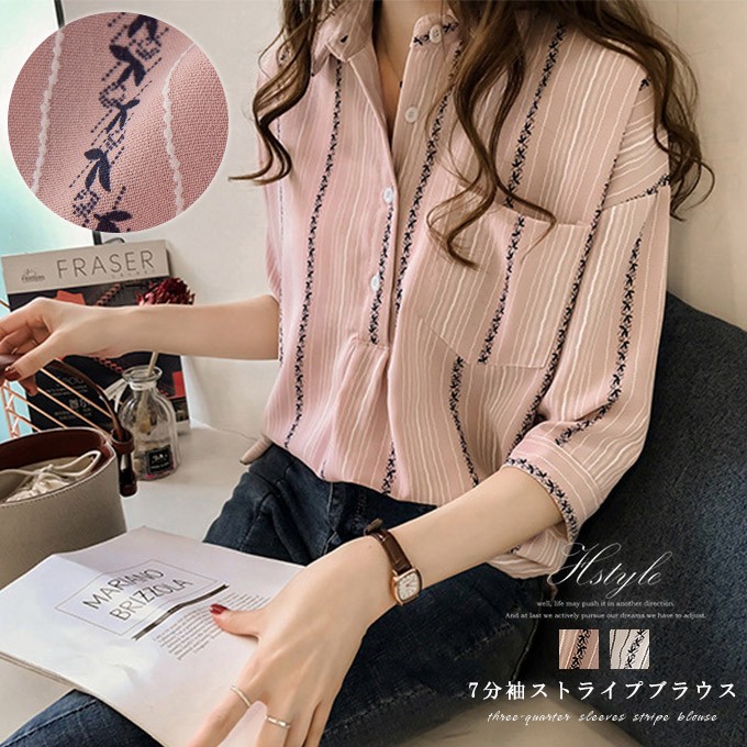 ブラウス シャツ トップス ストライブ柄 プルオーバー 縦ライン ポケット付き レディース 七分袖 体型カバー バック長め 韓国風 着回し カジュアル 通勤 ゆったりエレガントM フェミニン