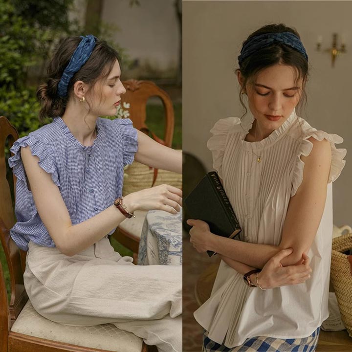 レディーストップス シャツ ブラウス カットソー フリル袖 前ボタンノースリーブ 袖フリル チェック ヘンリーネック プリーツ 前ボタン ブルー ホワイト 無地 可愛い カジュアル 涼しげ