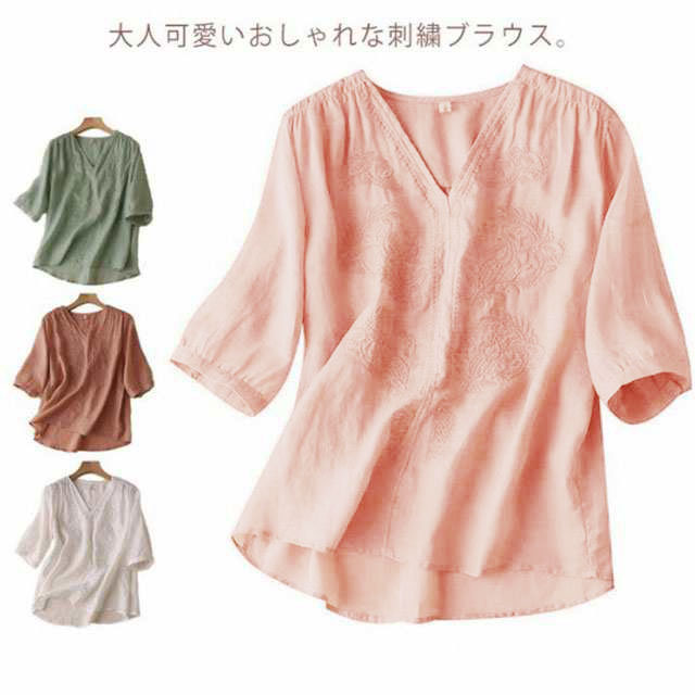 ブラウス レディース シャツ 刺繍 トップス 七分袖 Tシャツ プルーオーバー 綿麻 Vネック ゆったり 五分袖 体型カバー コットン リネン スリット 着痩せ 無地 涼しい おしゃれ カジュア 薄手
