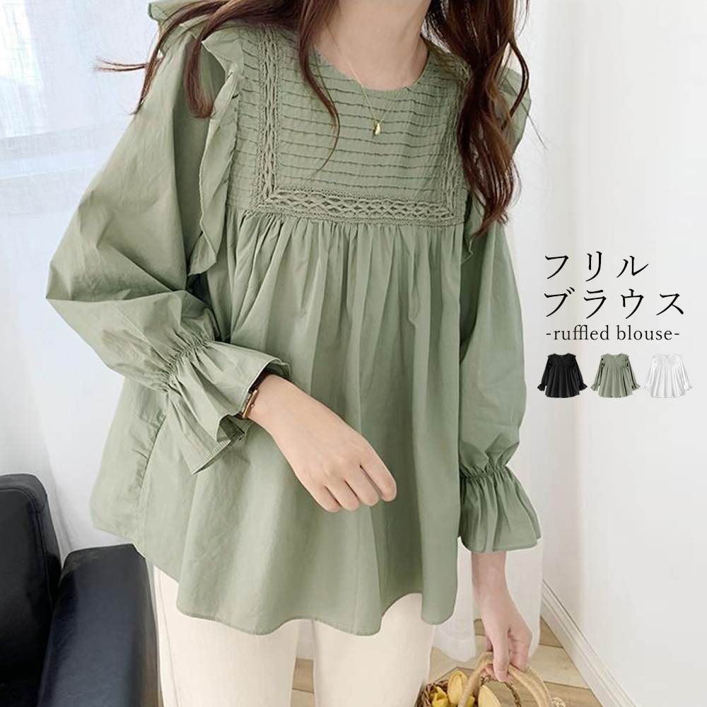 フリルブラウス レディース 長袖ブラウス キャンディスリーブ シャツブラウス 春秋夏 長袖トップス きれいめ タックブラウス 韓国ファッション 80GE オフィスカジュアル