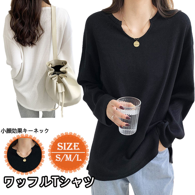キーネック ワッフルTシャツ レディース 秋 長袖 トップス tシャツ きれいめ シンプル Tシャツ 大きいサイズ 体型カバー おしゃれ 着回し 通勤 お出かけ 敬老の日 プ 無地フォーマル