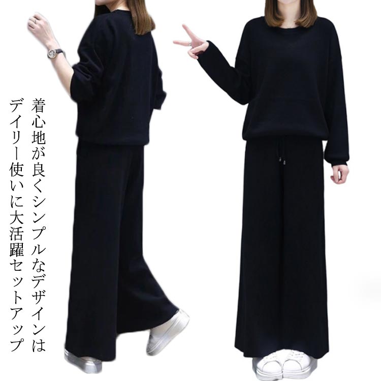 セットアップ ルームウエア ワイドパンツ トレーナー レディース ブラック カジュアル おしゃれ 春秋 長袖 部屋着 ゆったり 体型カバー 大きいサイズ 上下セット お出かけ クルーネック プ 着瘦せ