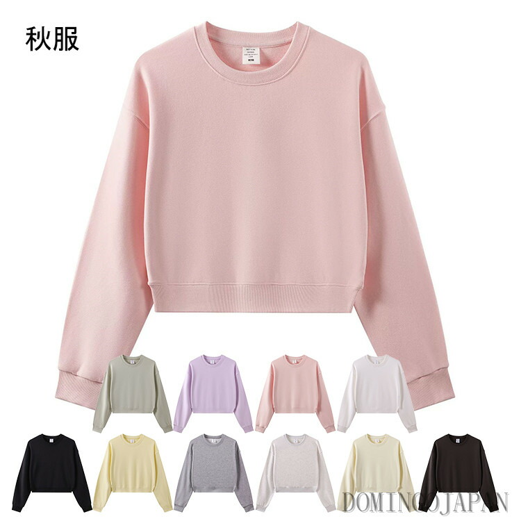トレーナー 長袖 ラウンドネック 無地 シンプル レディース 秋服 スウェット カットソー ショート丈 オシャレ カジュアル